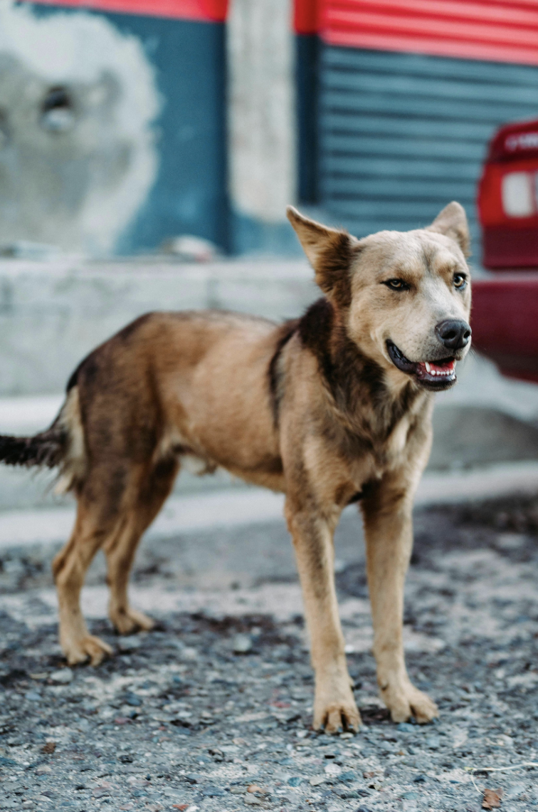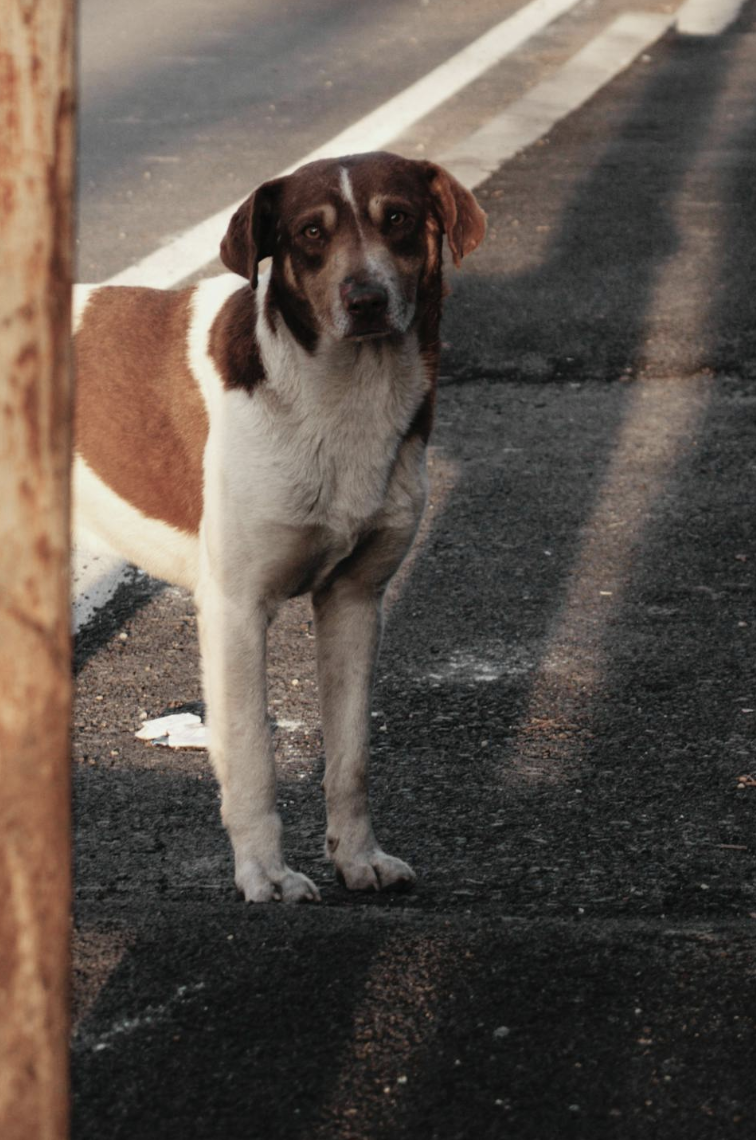 Una perra con manchas blancas y marrones se detiene curiosamente frente a una puerta verde, su expresión inquisitiva refleja su naturaleza exploratoria.
